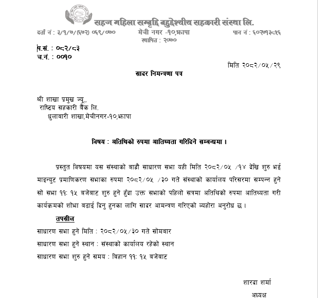 आज मिति २०८० साल भाद्र २३ गते शनिबार भएको दशौं वार्षिक साधारण सभा मा प्रस्तुत हुने अध्यक्ष काे प्रतिवेदन, वार्षिक बजेट तथा कार्यक्रम, स्वतन्त्र लेखा परीक्षक काे प्रतिवेदन,स्मारिका वितरण ,